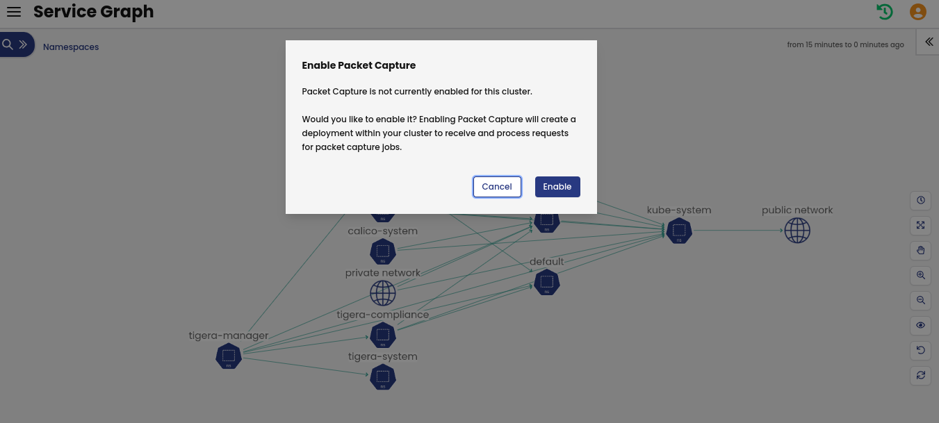 Packet capture integration with Service Graph makes it very easy to capture traffic for a specific namespace, service, replica set, daemonset, statefulset, or pod. Just right-click on an endpoint to start or schedule a capture, and then download capture files to your favorite visualization tool like WireShark.